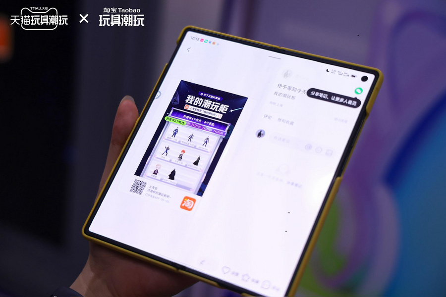 在WF展会淘天展区,玩家们争相体验淘宝“我的潮玩柜”功能,并即时分享至社交平台,时刻与其他玩家共享自己收藏潮玩产品的进度。