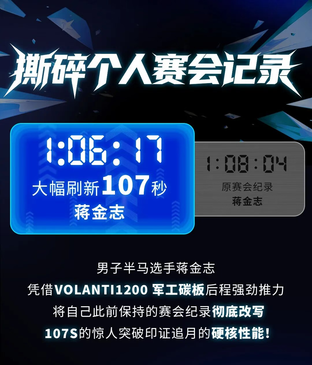 本次赛事中,沃兰迪 "追月" 跑鞋成为焦点。该系列跑鞋采用VOLANTI 1200军工级碳板技术,为运动员提供了强劲的后程推动力 中底 V-Bounce 球科技 peba爆米花发泡中底及微胶囊自修复耐磨橡胶大底更是在耐磨缓震领域走出新赛道。男子半马选手蒋金志凭借这一利器,以 1 小时 06 分 17 秒的成绩大幅刷新赛会纪录 107 秒,充分印证了航天科技在运动装备中的实际效能。