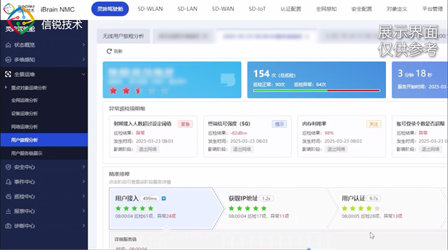 借助光AP自带AI芯片和信锐全网智能灵眸AI引擎(图二),全光4.0形成A5i能力架构,多维度对网络链路质量、业务运行质量、用户上网体验进行感知,动态量化网络质量,预测、监视、追溯网络问题,并提供常见网络故障处理建议,大力提升运维效率。