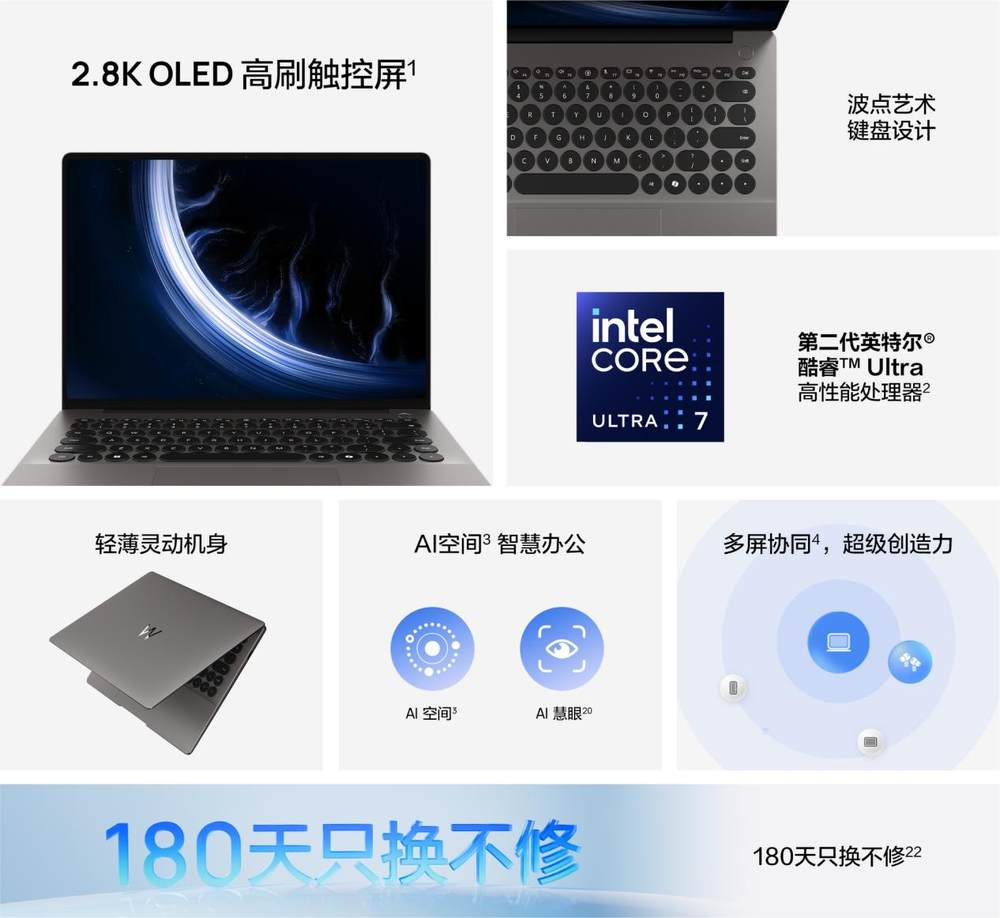 这款轻薄笔记本拥有多项“同档独有的旗舰级配置”,从独家波点艺术键盘,到全系标配、看齐万元旗舰的2.8K OLED 高刷触控屏, 以及强大的AI智慧功能和超材料天线加持的通信能力等越级技术,全方位超越同级竞品,成为主流价位段轻薄本的 “标杆之选”。首销期间,购机享“180 天只换不修”与丰富的晒单赠礼福利,进一步强化其降维碾压同档的质价比优势。