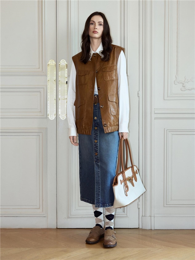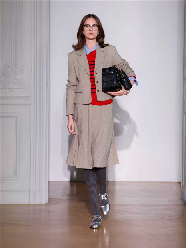 充满“冲突感”的混搭手法贯穿本次发布秀,为经典单品注入全新的时尚叙事。标志性的格纹大衣与西装、充满摩登感的皮革外套、知识分子撞色毛衫和自由休闲日装组合,通过强烈对比的层次叠穿,混合不同风格语言,既矛盾又和谐,让传统精英气质与现代独立精神兼容并存,展现女性多面的魅力。
