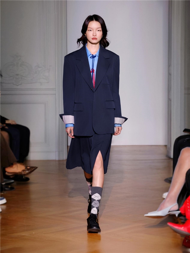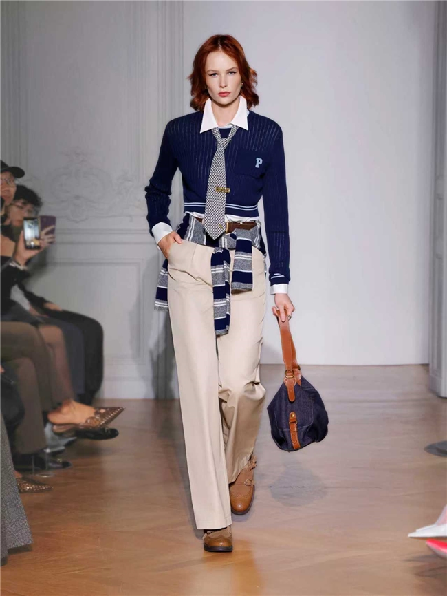 这次发布秀将盘扣、立领与腰部装饰中式元素,通过解构重组手法演绎出全新的东方美学,在现代语境中焕发新生。精心设计的章仔胸针、多变领带与中国结配饰碰撞出妙趣新意,升格为鲜明的视觉语言,成为延伸自我风格的一部分,为整体造型增添点睛之笔。