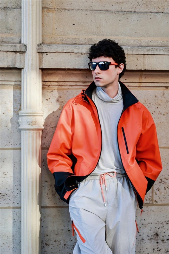 此次大秀,雪豹以“游牧都市”为命题,彻底打破传统皮装的厚重刻板印象。系列从自然时序汲取灵感,专利防水皮革轻韧如甲——通过鞣制阶段加入防水助剂与纳米涂层,构建“防渗入毛细孔+表面成膜”双重防护;淡彩粉、冰川灰等取自大地冰川的色彩,将自然诗意转化为当代设计语言。可拆卸组件、仿生拼接结构,再加上记录皮革来源与碳足迹的材质溯源芯片,既贴合年轻群体对功能、环保的双重需求,更让企业在迭代中焕发鲜活活力。