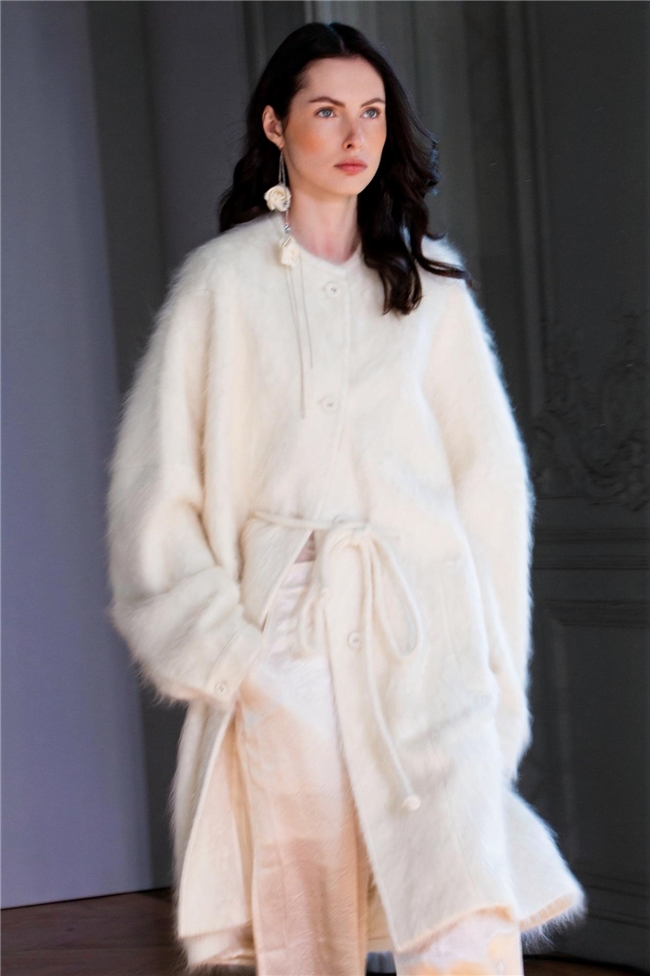 品牌精选羊毛羊绒、醋酸、有机棉麻等高端天然时装面料,以大地色系为基底,点缀灰绿、陶土红等低饱和有彩色,传递宁静安稳的氛围;立体压褶、面料再造、可转换设计等工艺,让服装兼具雕塑感与实用性。从廓形大衣、可拆卸皮草外套,到职场旅行两用套装,如月设计覆盖多元场景,既满足都市精英的情感依托需求,也契合独立女性对风格与舒适的追求,精准承接不同客群偏好。